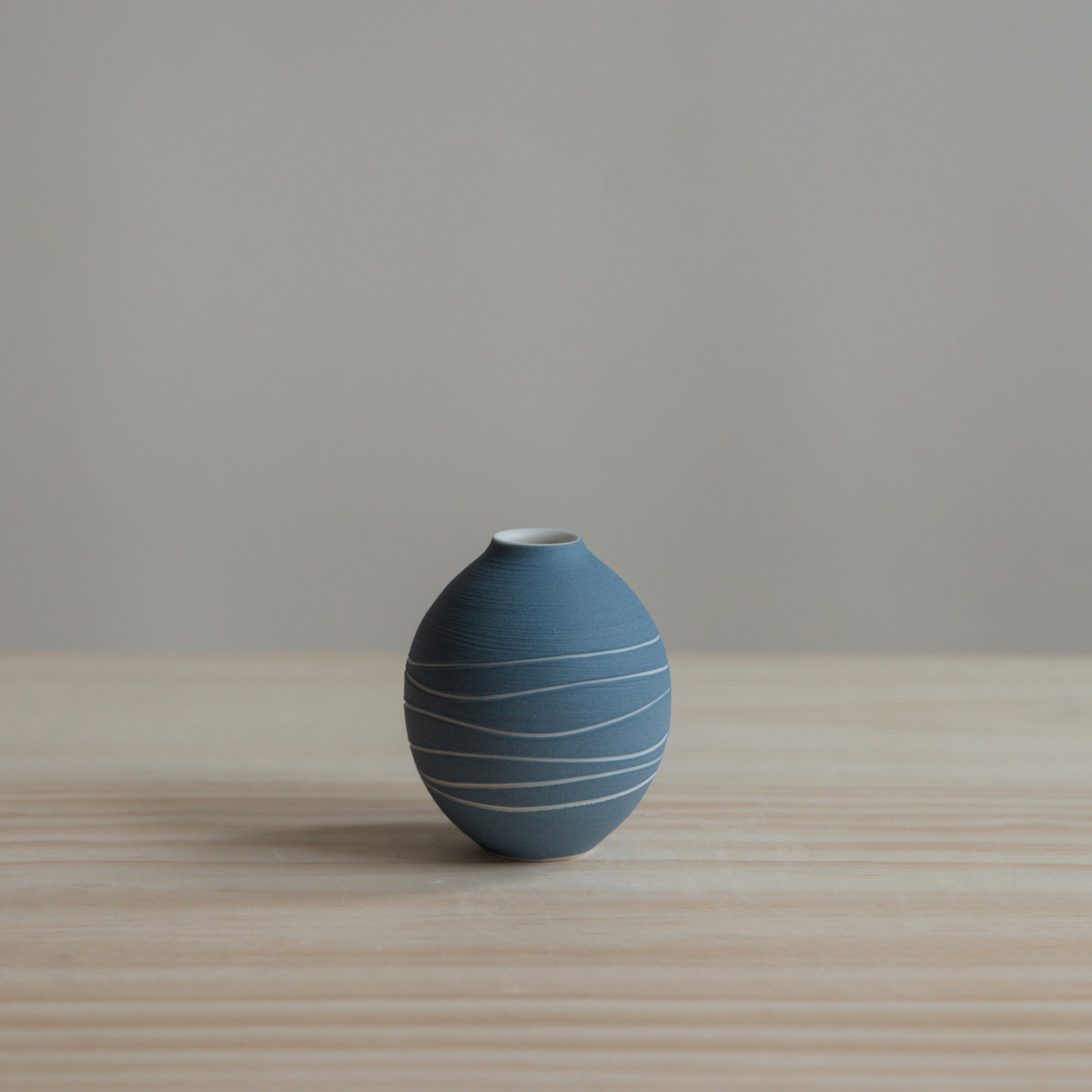 This delicate porcelain trio captures the essence of simplicity. Each piece is wheel-thrown, showcasing a unique blue pattern that emerges from the the subtle dialogue between the spinning wheel and my hand. Its unglazed exterior invites touch, offering a tactile connection to the raw, natural material.