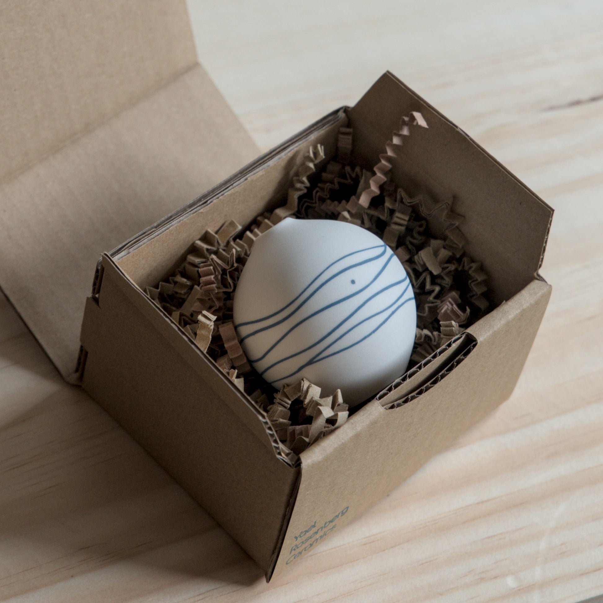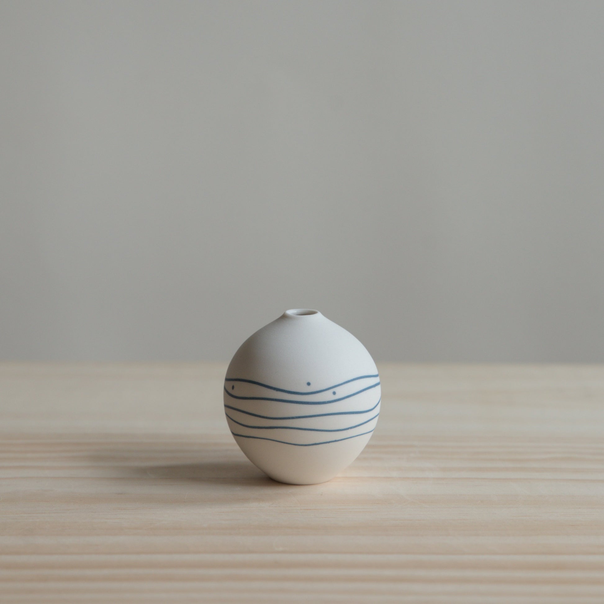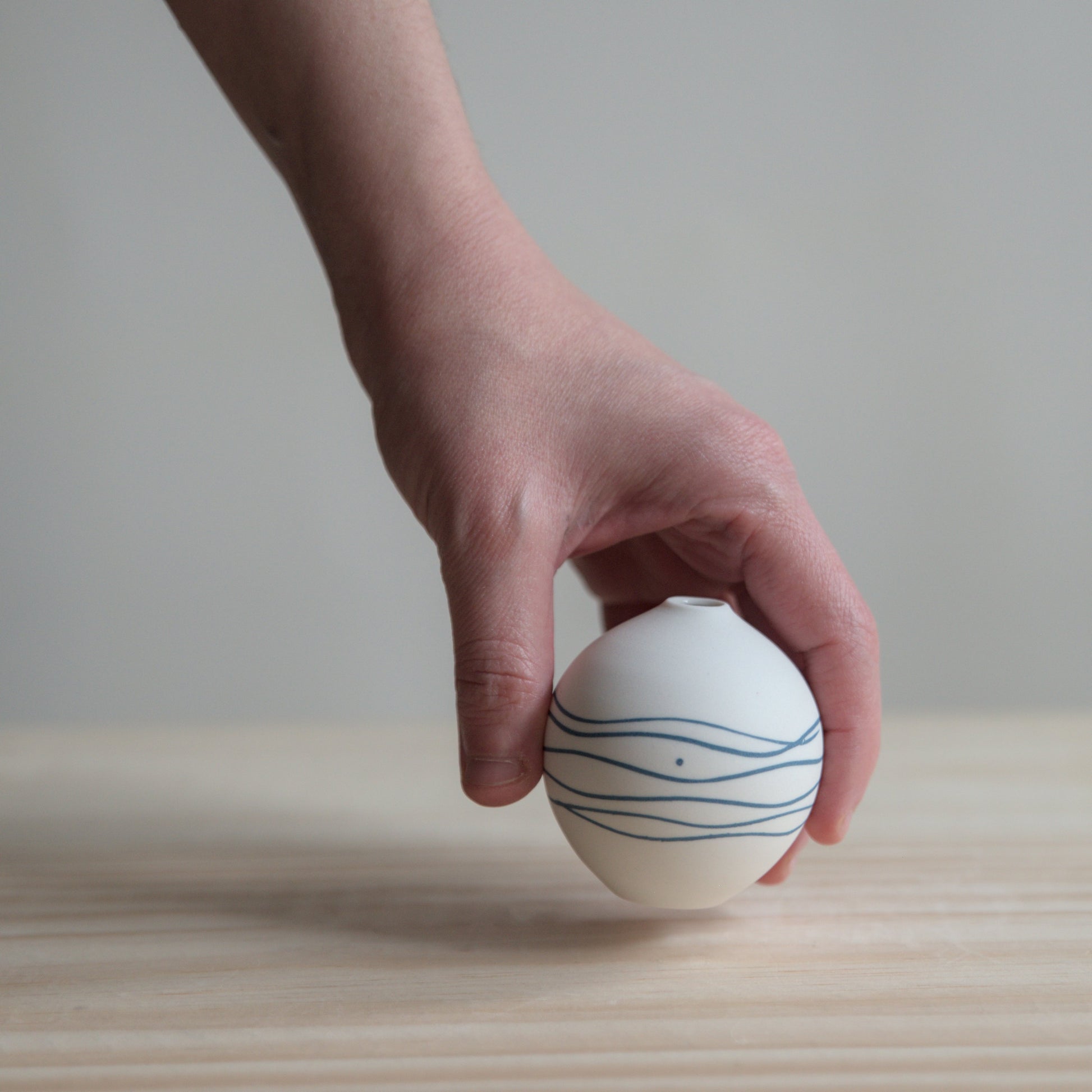 This delicate porcelain vase captures the essence of simplicity. Each piece is wheel-thrown, showcasing a unique blue pattern that emerges from the the subtle dialogue between the spinning wheel and my hand. Its unglazed exterior invites touch, offering a tactile connection to the raw, natural material.