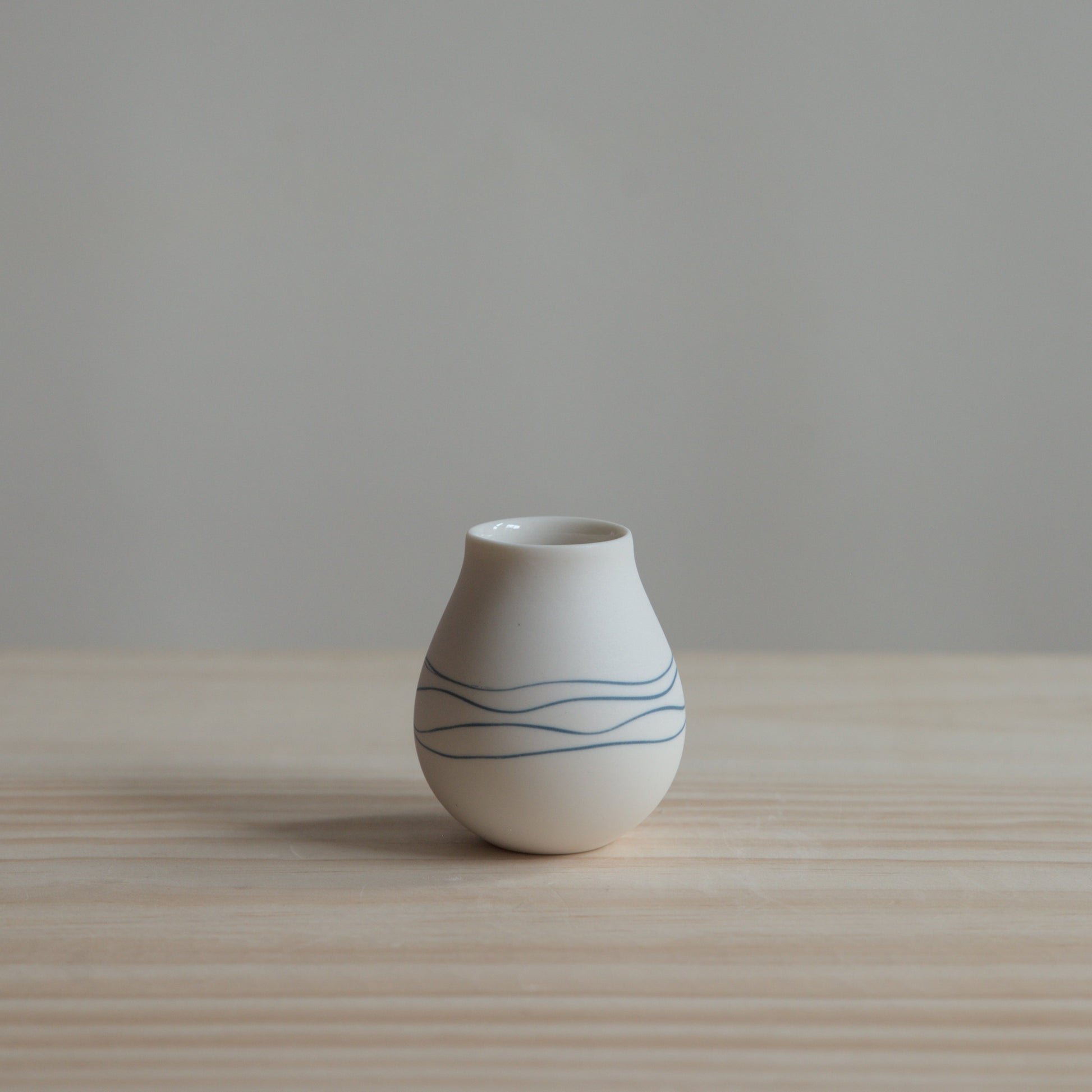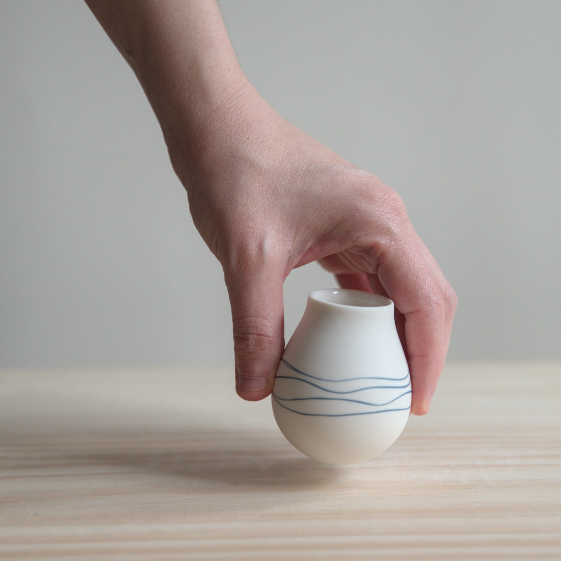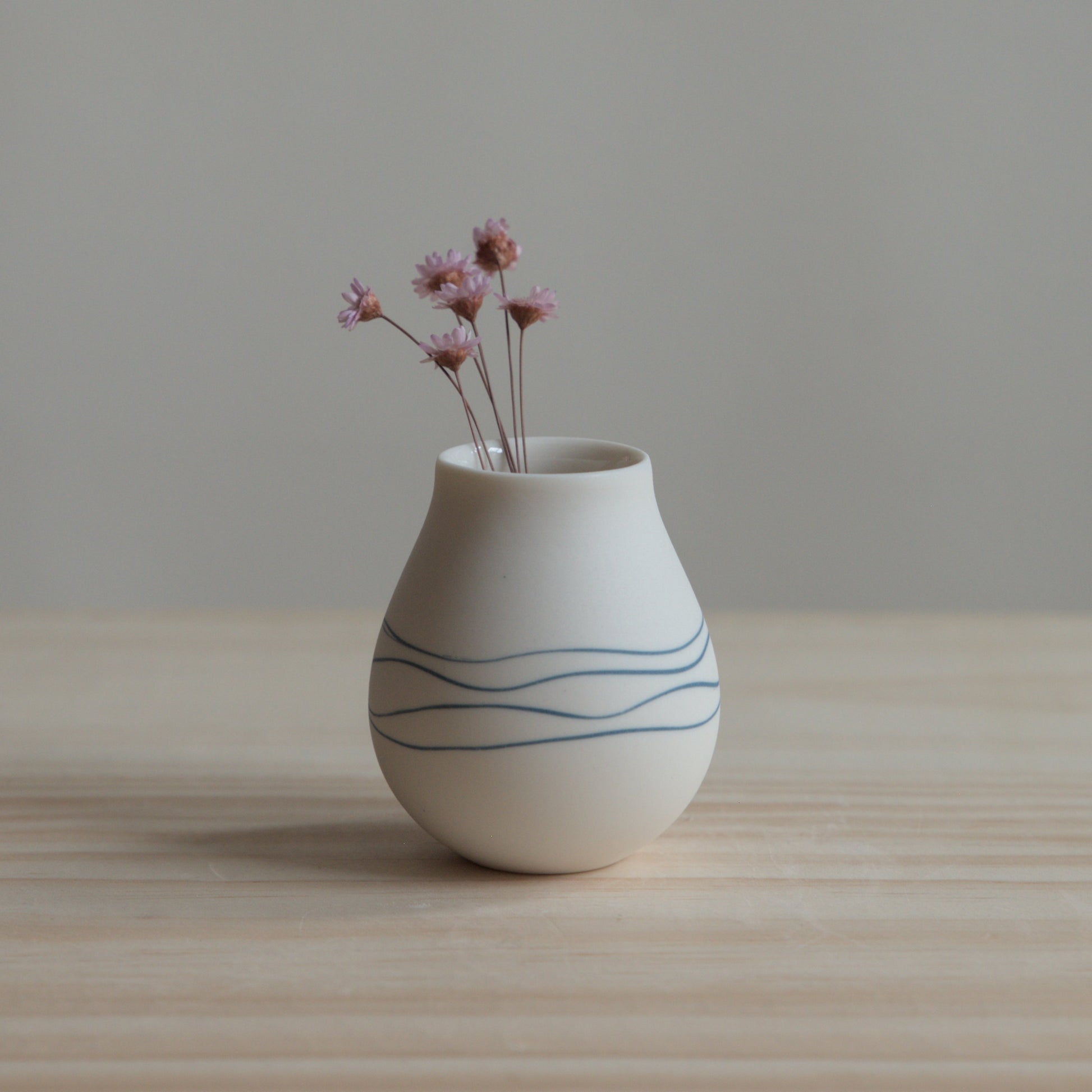This delicate porcelain vase captures the essence of simplicity. Each piece is wheel-thrown, showcasing a unique blue pattern that emerges from the the subtle dialogue between the spinning wheel and my hand. Its unglazed exterior invites touch, offering a tactile connection to the raw, natural material.