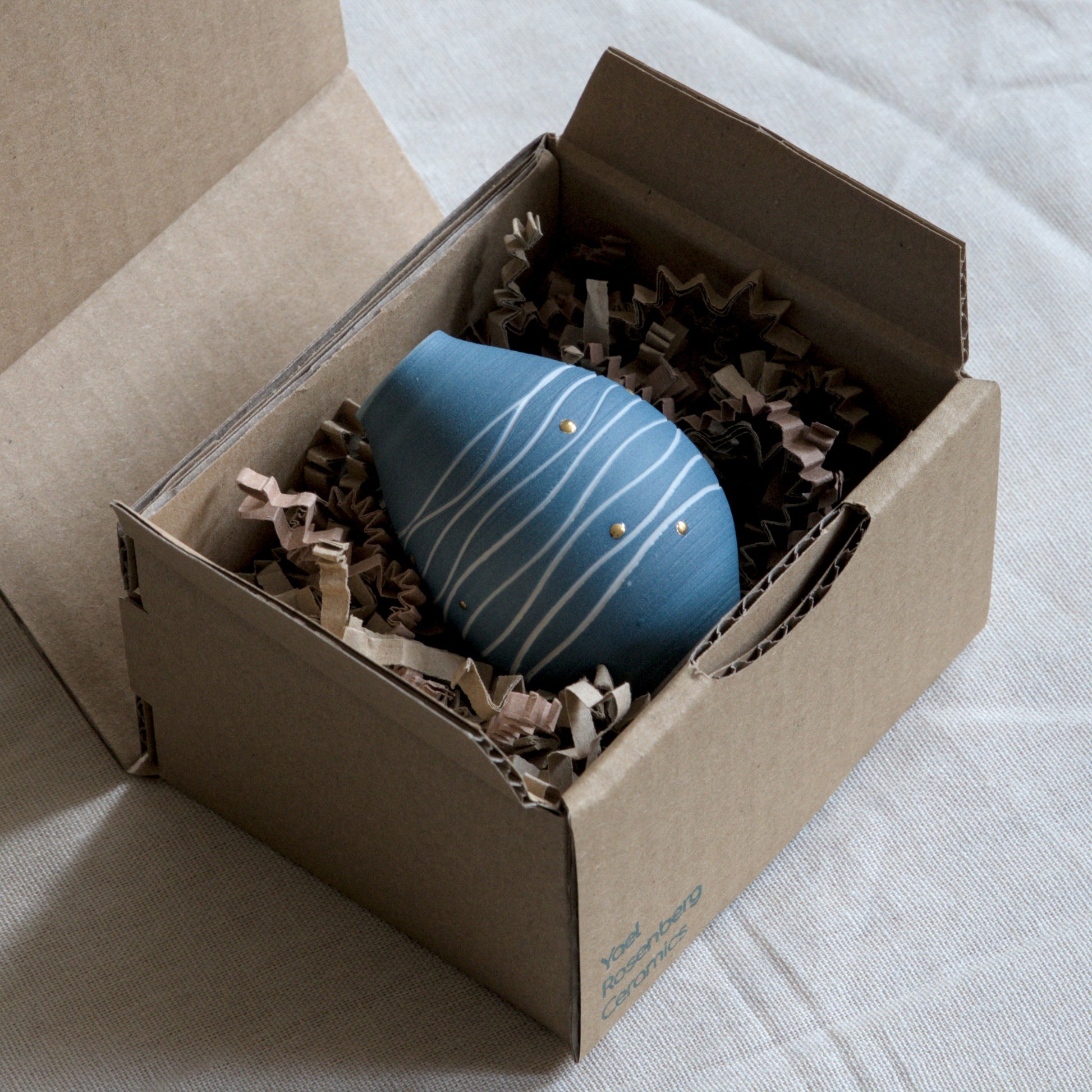 This delicate porcelain vase captures the essence of simplicity. Each piece is wheel-thrown, showcasing a unique blue pattern that emerges from the the subtle dialogue between the spinning wheel and my hand. Its unglazed exterior invites touch, offering a tactile connection to the raw, natural material.