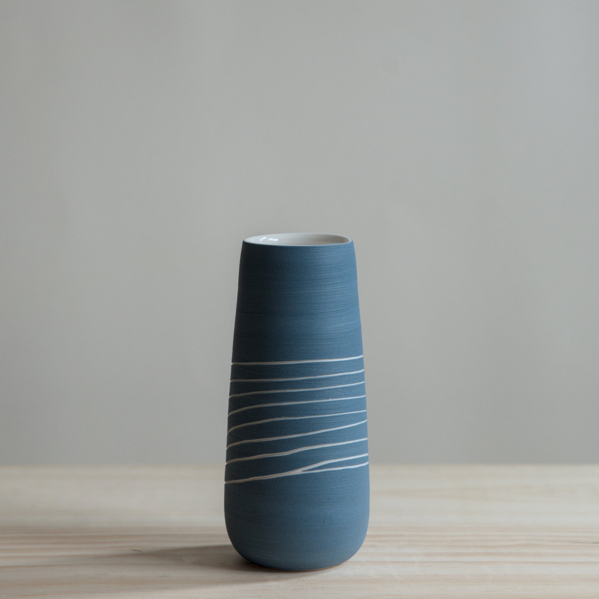 Each vase is carefully thrown on the wheel, with a unique blue pattern that comes from the rhythm between the wheel, my hand, and the carving tool. The unglazed exterior has a soft, tactile feel.