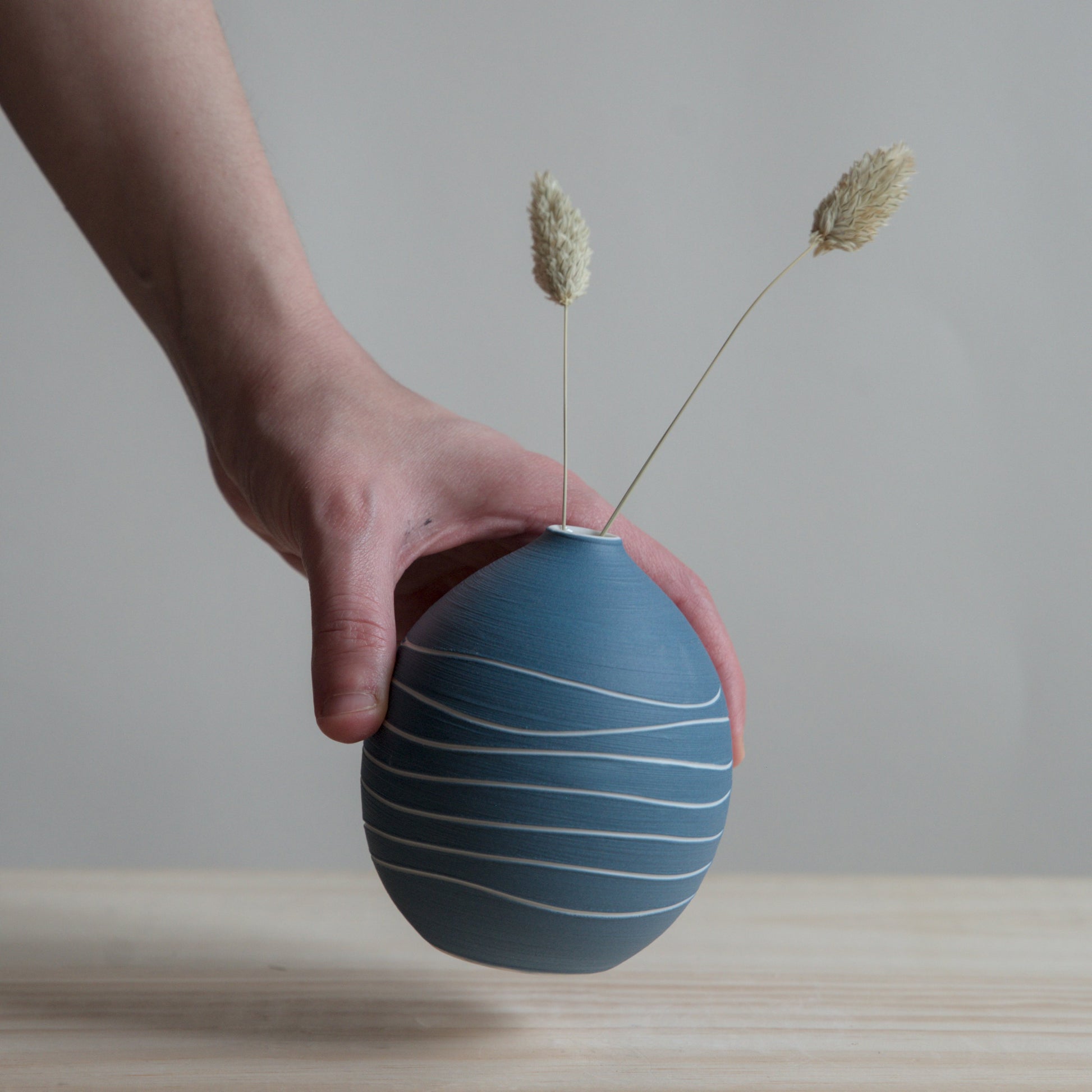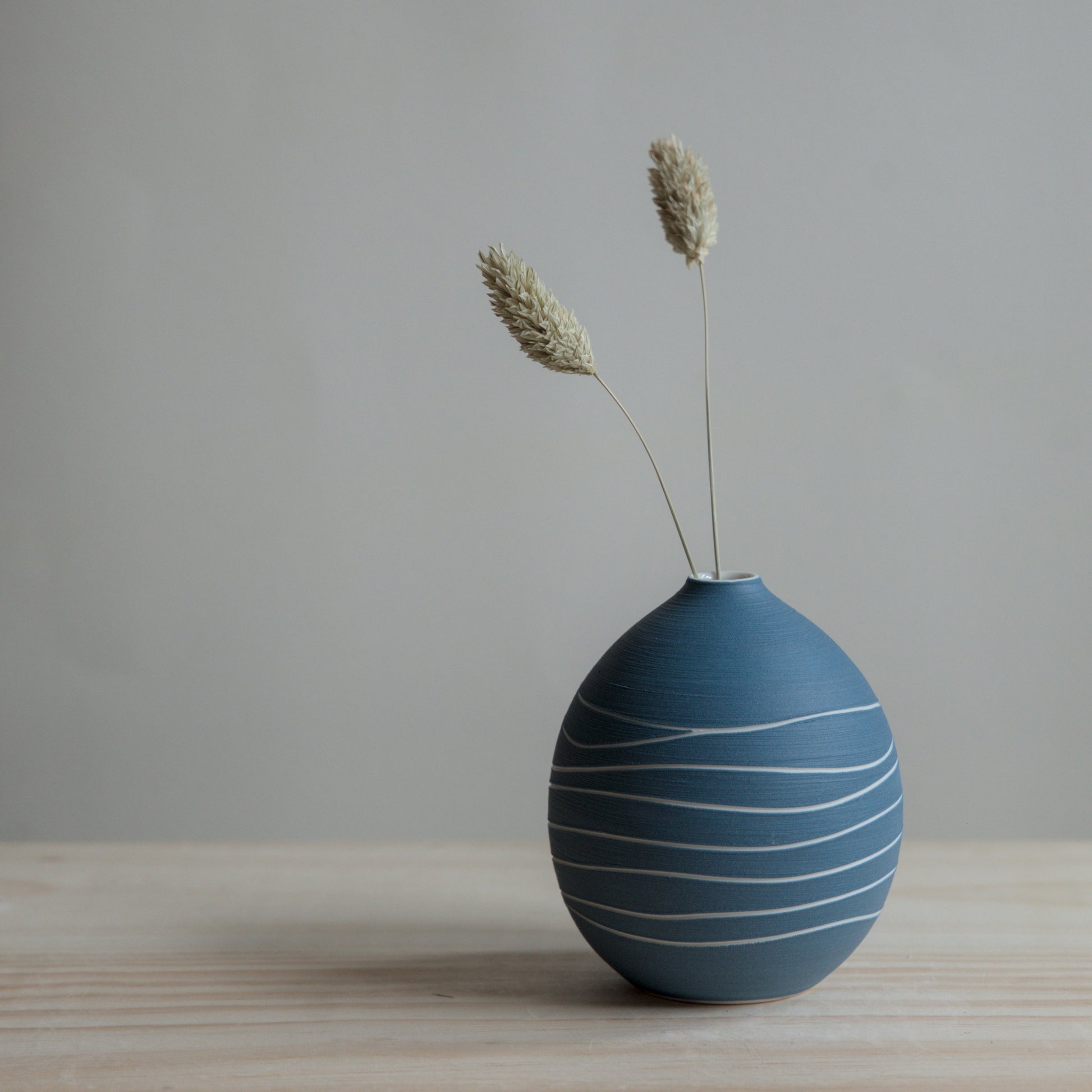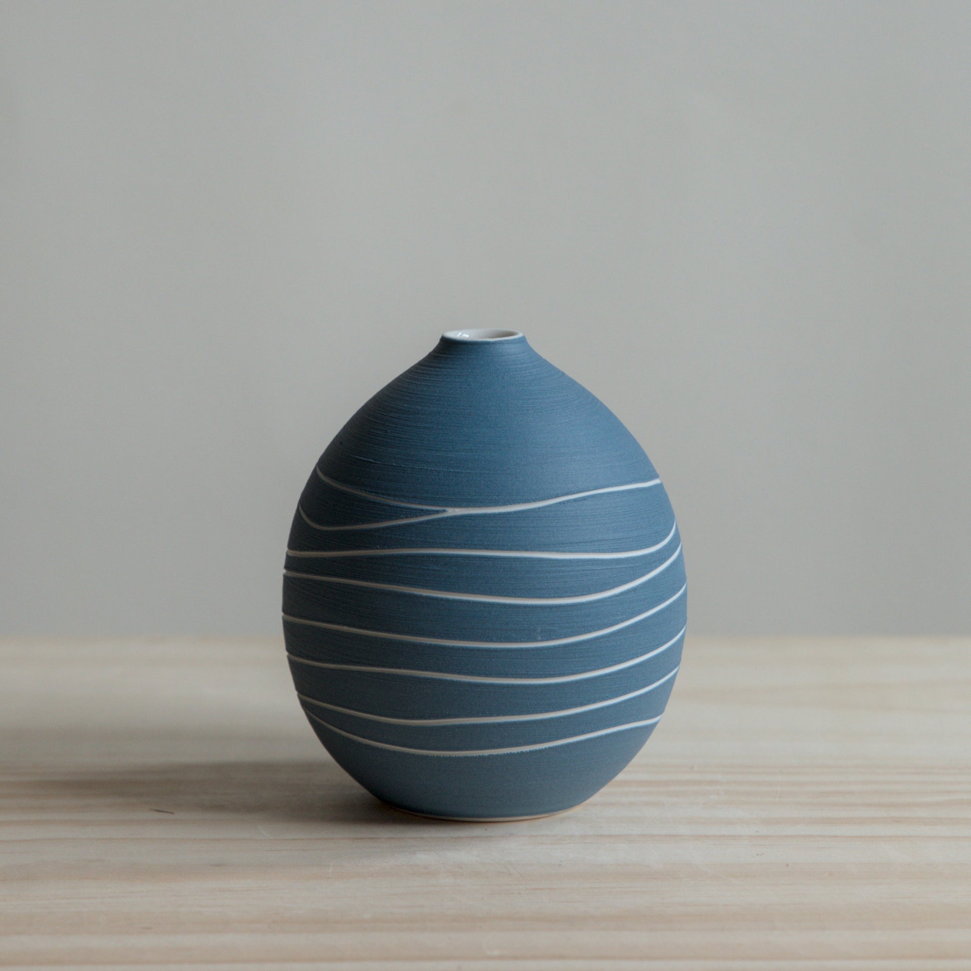 Each vase is carefully thrown on the wheel, with a unique blue pattern that comes from the rhythm between the wheel, my hand, and the carving tool. The unglazed exterior has a soft, tactile feel.