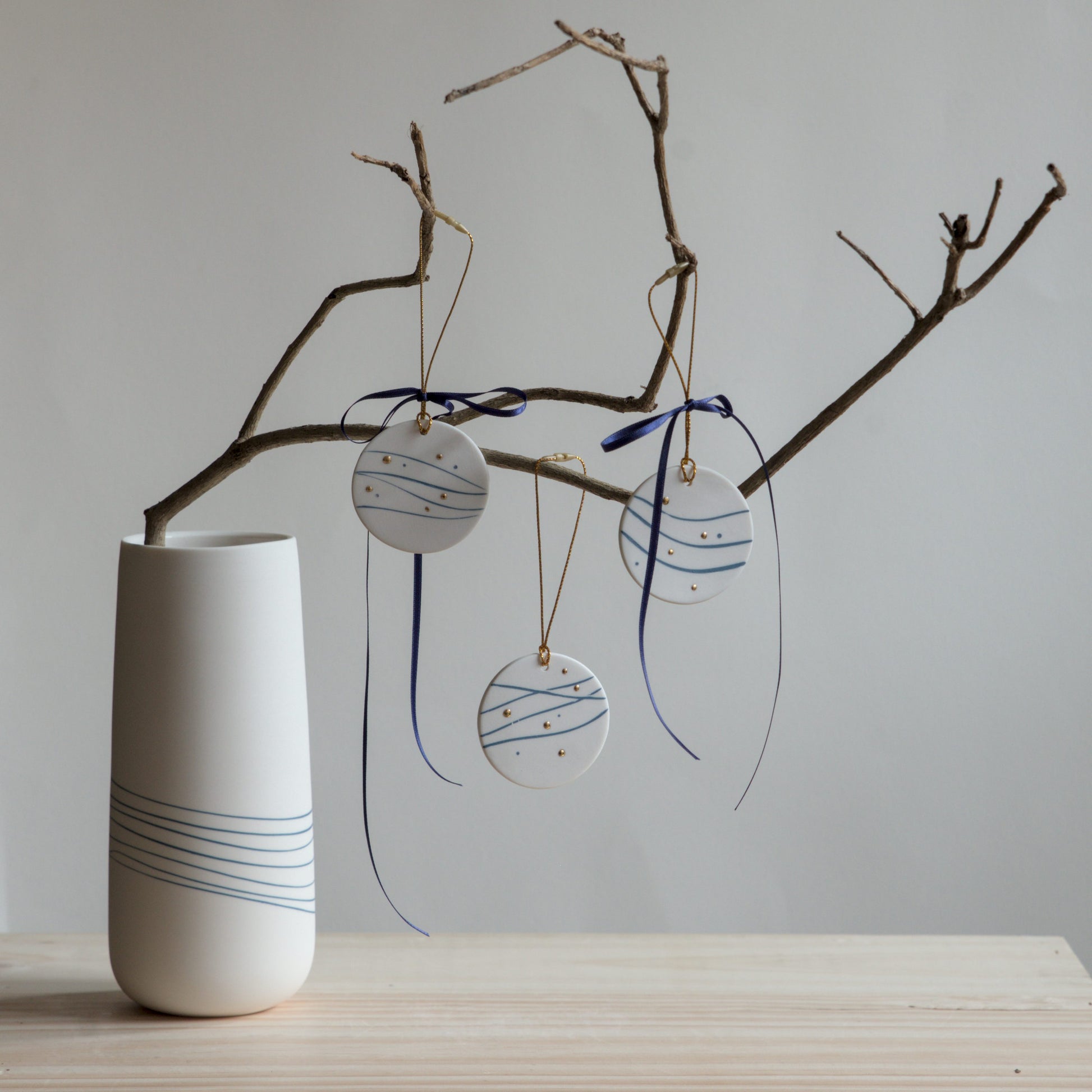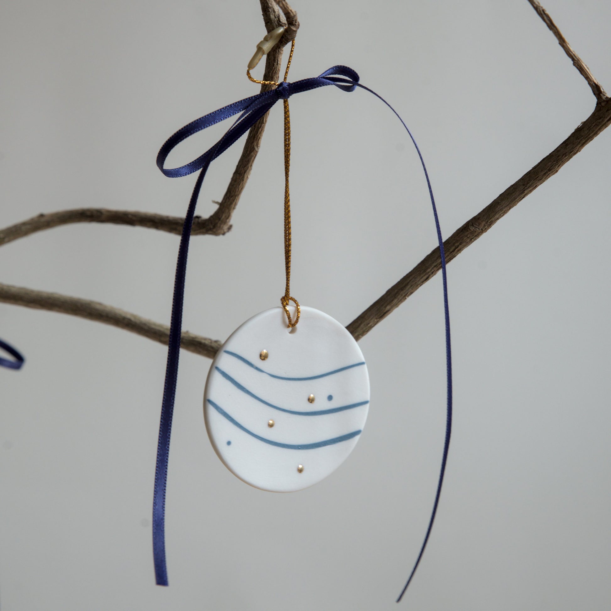 Surface is left unglazed, finished with delicate 24k gold lustre drops. Each piece is tied with a blue ribbon that adds a gentle sense of movement